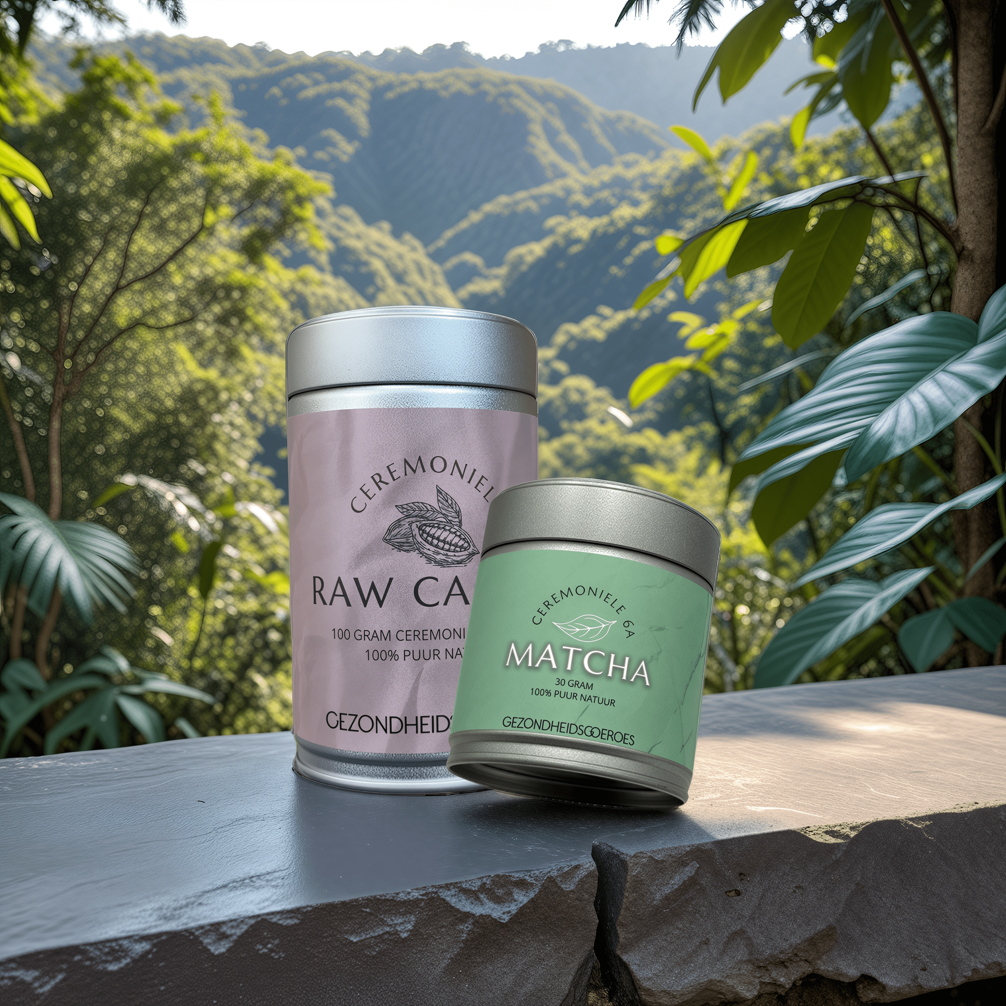 Matcha & Cacao. Deze set bevat één pot hoogwaardige matcha en één pot pure cacao. Beide producten zijn rijk aan antioxidanten, waaronder krachtige polyfenolen en flavonoïden. Zowel de matcha als de cacao in deze set zijn van ceremoniële kwaliteit, wat betekent dat ze met de grootste zorg zijn geselecteerd en verwerkt.
