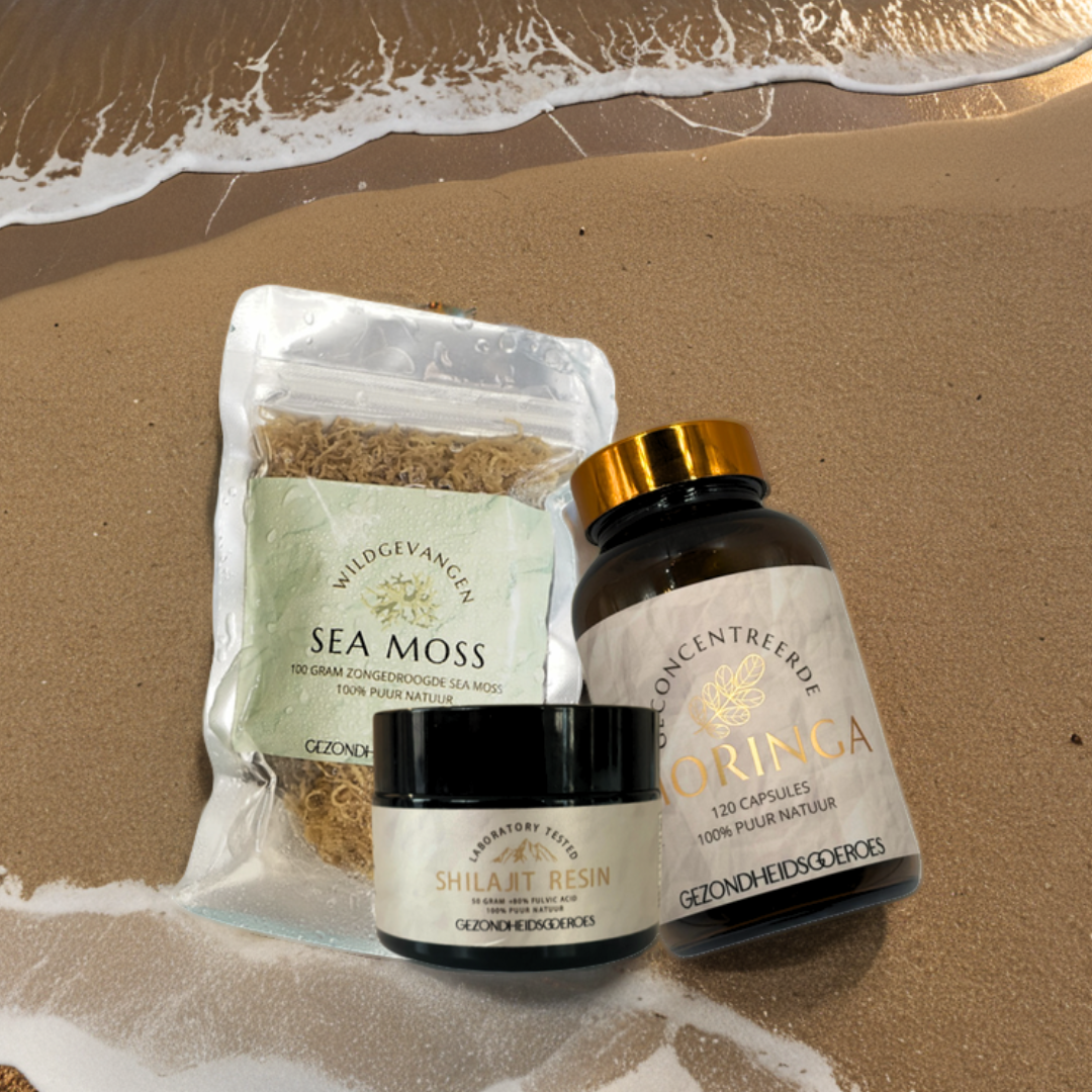 Shilajit, Sea Moss & Moringa. Door uitgeputte landbouwgrond heeft ruim 80% van de Nederlanders een chronisch mineralen tekort. Dit leidt op langer termijn tot veel problemen zoals vermoeidheid, een slechte huid, gemakkelijk aankomen en haaruitval. Vul ze gemakkelijk aan !