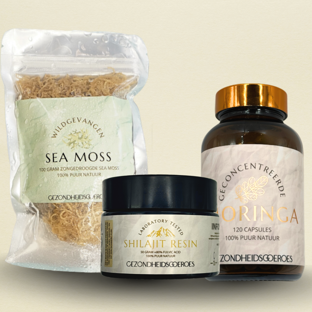 Shilajit, Sea Moss & Moringa. Door uitgeputte landbouwgrond heeft ruim 80% van de Nederlanders een chronisch mineralen tekort. Dit leidt op langer termijn tot veel problemen zoals vermoeidheid, een slechte huid, gemakkelijk aankomen en haaruitval. Vul ze gemakkelijk aan !