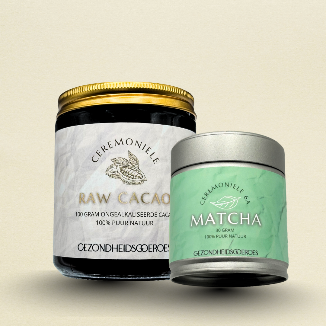 Matcha & Cacao. Deze set bevat één pot hoogwaardige matcha en één pot pure cacao. Beide producten zijn rijk aan antioxidanten, waaronder krachtige polyfenolen en flavonoïden. Zowel de matcha als de cacao in deze set zijn van ceremoniële kwaliteit, wat betekent dat ze met de grootste zorg zijn geselecteerd en verwerkt.