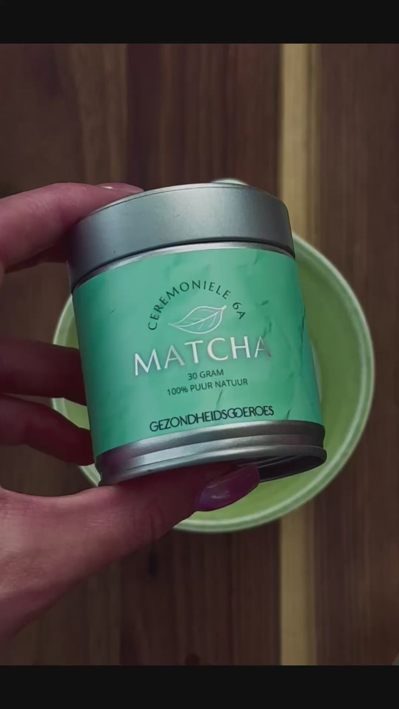 Matcha is een traditionele drank uit Japan. En het wordt met de dag populairder over de gehele wereld om zijn eindeloze gezondheidsvoordelen. Matcha is letterlijk groene thee poeder. Normaal worden groene thee blaadjes in water geweekt en dan krijg je een kopje thee. Bij matcha is dit wat anders. 4 weken voor de oogst wordt de theestruik bedekt met schaduwdoeken. Hierdoor gaat de theestruik automatisch van nature meer chlorofyl aanmaken wat de bladeren hun levendige groene kleur geven. De L-Theanine wordt gestimuleert. En je krijgt een zoete zachte groene thee. Vervolgens nadat ze worden geplukt worden ze gestoomd, gedroogd en gemalen tot een hele fijne poeder. Matcha is zo uniek omdat je verschillende soorten kwaliteiten hebt. Hoe donkerder de matcha, des te goedkoper het product maar ook des te bitterder en minder smaakvol. Hoe fel groener de kleur, des te smaakvoller en zoeter de matcha is. Daarom spreken mensen altijd van: Ceremoniele matcha. Dit wil zeggen dat de matcha van hoge kwaliteit is met een natuurlijke zoete smaak en felgroene kleur.