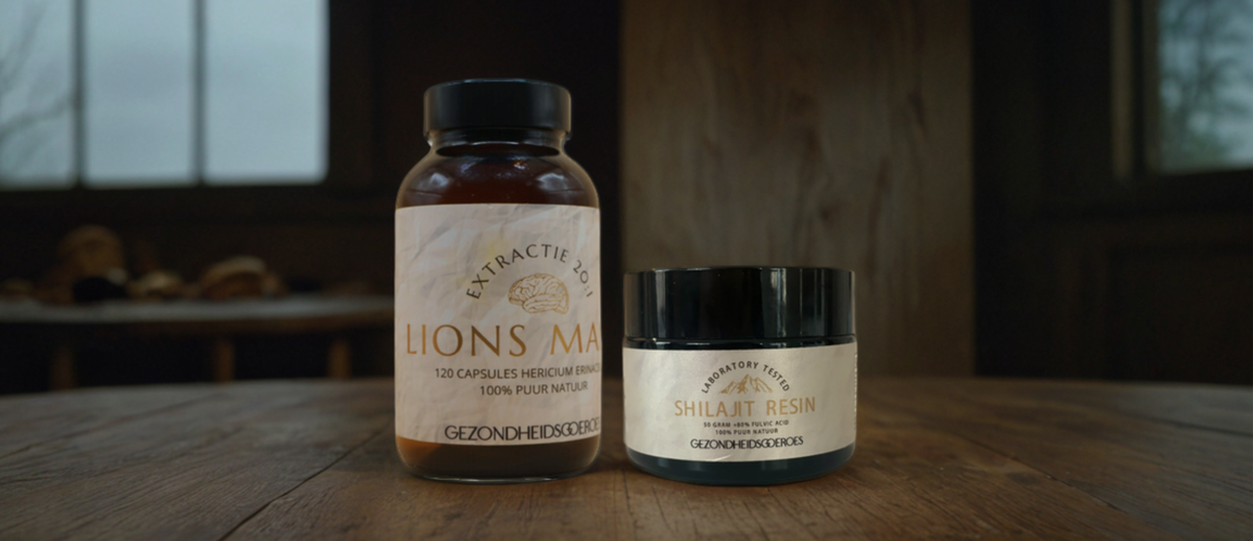 100% pure shilajit resin & Lions Mane paddestoel 20:1 extract omhuld in een hydroxypropylmethylcellulose.