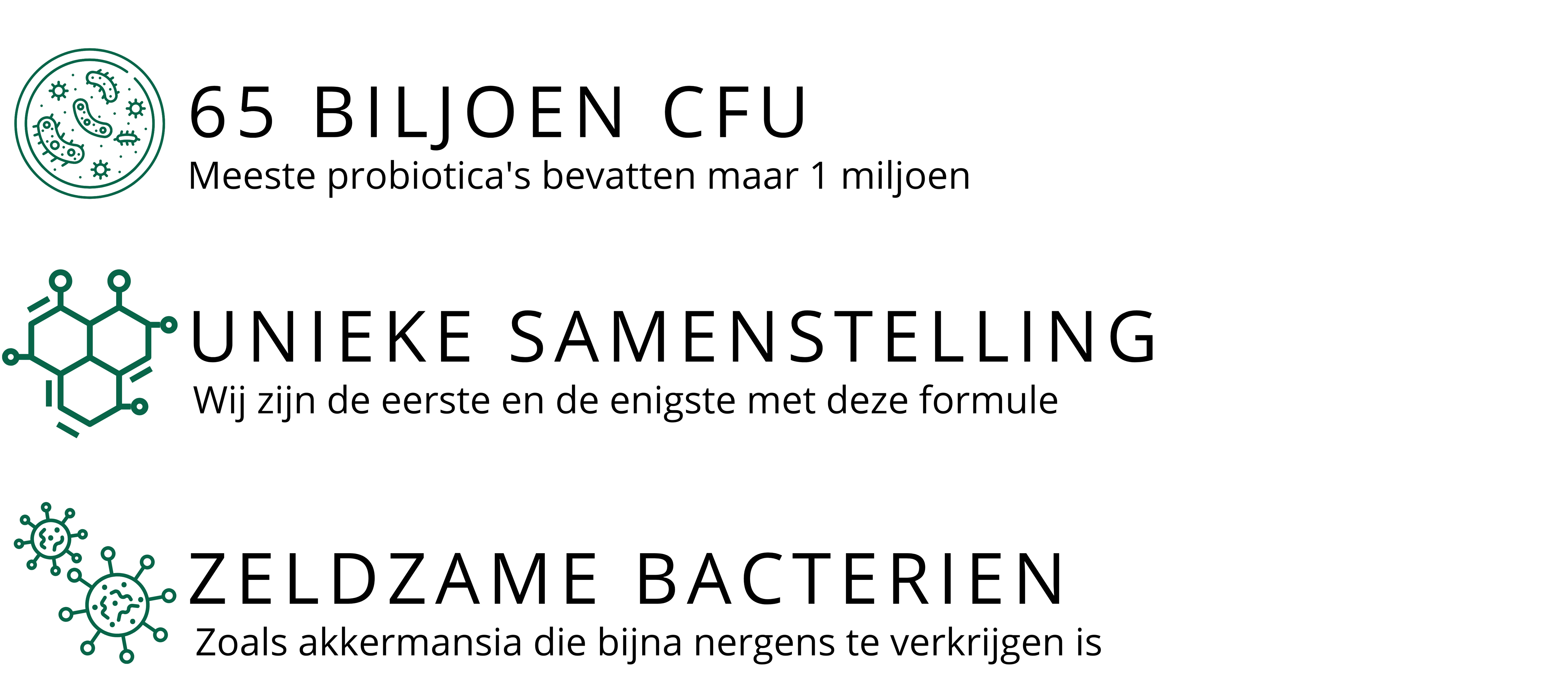 Probiotische blend (met actieve of inactieve stammen): Clostridium butyricum Lactobacillus reuteri (DSM 17938) Lactiplantibacillus plantarum (299v) Bacillus subtilis Bacillus coagulans Akkermansia muciniphila (pasteuriseerde vorm) Lactobacillus helveticus (ROO52) Limosilactobacillus fermentum Bifidobacterium longum subsp. infantis Streptococcus thermophilus Leuconostoc mesenteroides, Overige ingrediënten: Plantaardige capsule (hypromellose, gellan gum)
