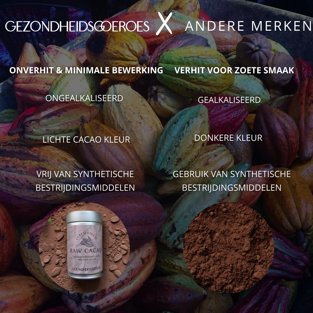 Wat is rauwe, ongealkaliseerde cacaopoeder? Rauwe, ongealkaliseerde cacaopoeder is cacao die niet verhit is en waarbij geen chemisch alkaliseringsproces is toegepast. Hierdoor blijven de natuurlijke antioxidanten, enzymen en mineralen optimaal behouden. Dit maakt het de puurste en meest voedzame vorm van cacao. Cacao heeft talloze gezondheidsvoordelen. Mede door zijn enorm hoge waarde aan zeer krachtige antioxidanten. Daarnaast is het enorm rijk aan magnesium en andere belangrijke mineralen die wij moderne mensen steeds meer tekortkomen, onder andere door uitgeputte landbouwgrond. Onze cacao is volledig vrij van toevoegingen en heeft een minimaal bewerkingsproces om alle belangrijke voedingsstoffen te behouden. Met 1 kopje cacao per dag krijg je al +92% van je dagelijkse antioxidanten binnen.